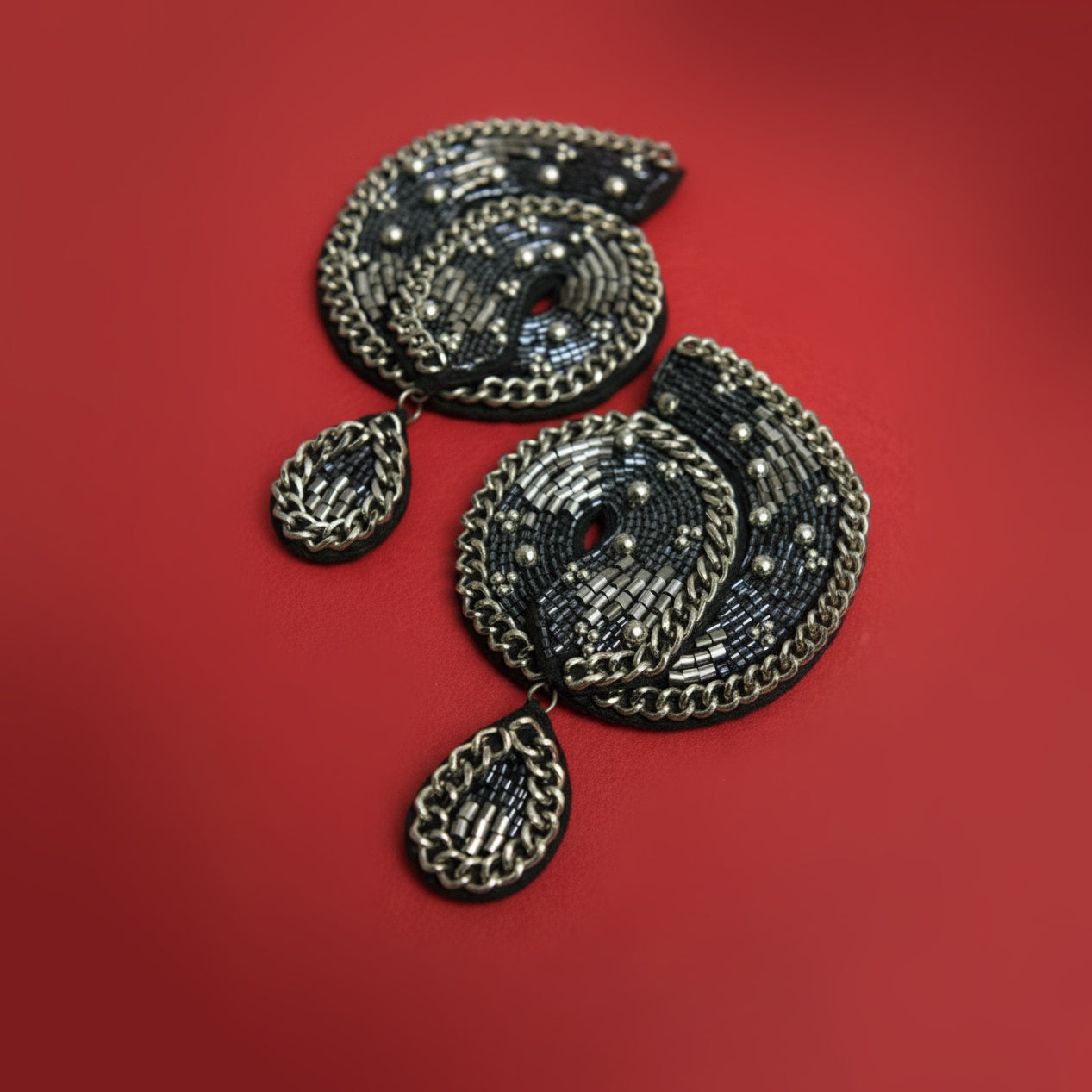 Add a fierce, captivating edge with these succinct coiled statement studs. Featuring a mesmerizing black and silver micro-beaded spiral, these earrings are framed and accented by an edgy silver chain link that coils inward. The unique texture and bold, round shape create a look that's instantly maximalist and effortlessly rock-chic. They're a conversation starter, guaranteed.