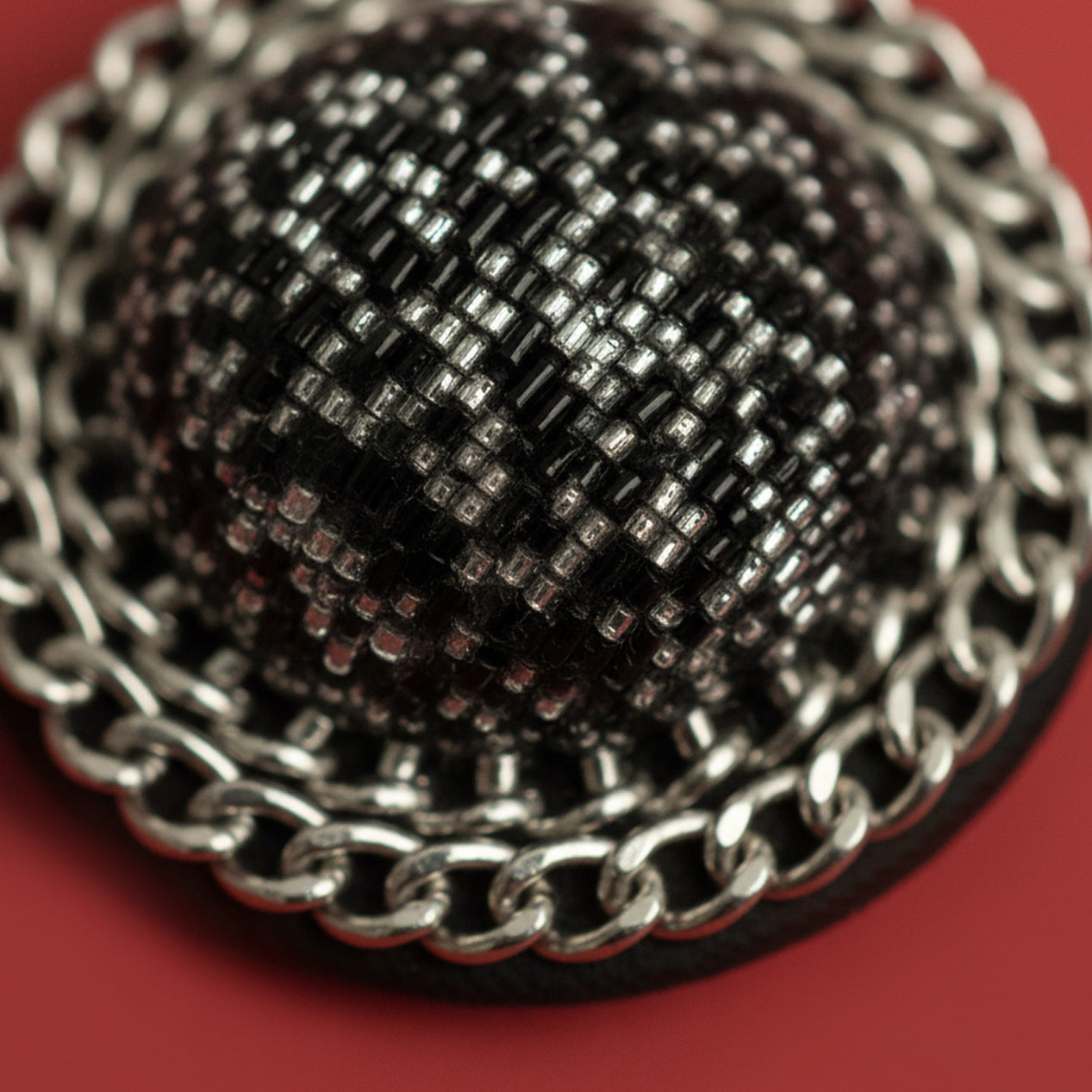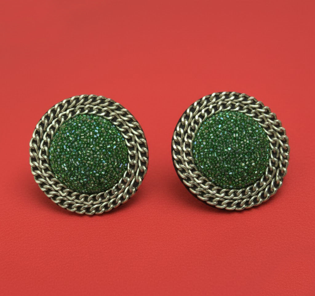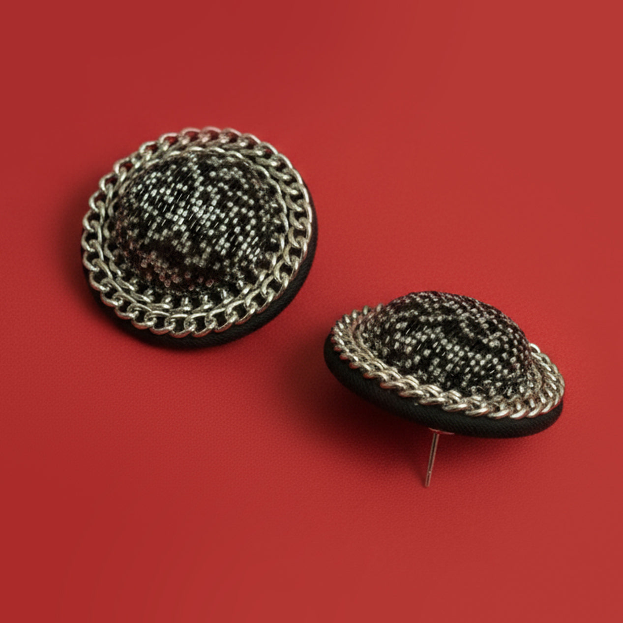 Get the perfect mix of edgy and elegant with these succinct statement studs. They feature a striking, tightly embroidered and beaded mosaic center, beautifully encircled by a contrasting chunky silver chain link trim. The round, domed shape offers a bold profile while remaining versatile enough for day or night wear. A must-have for adding texture and a touch of rock-chic glamour to your jewelry collection.