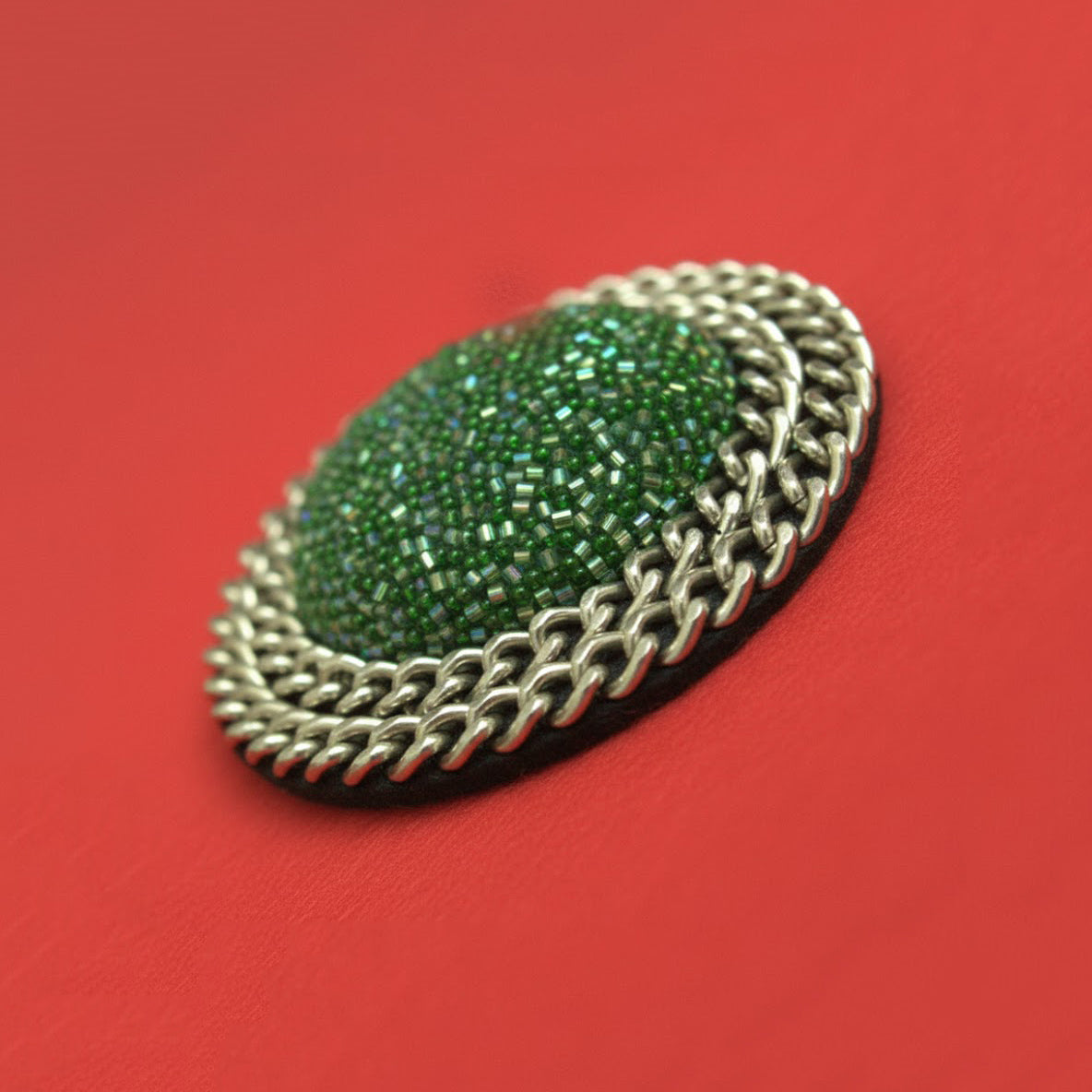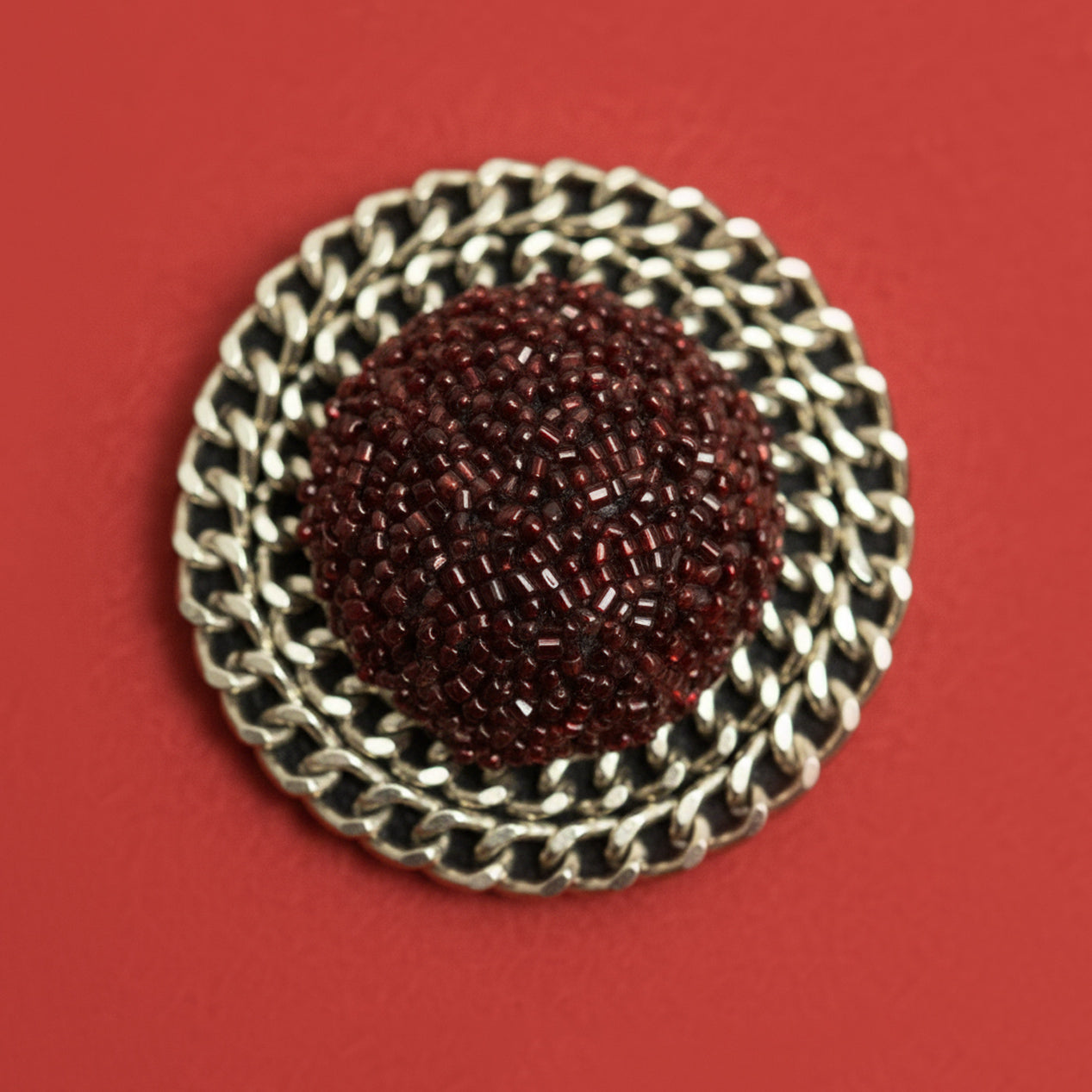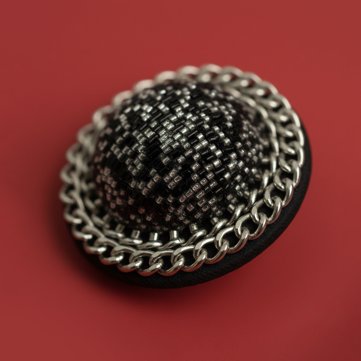 Get the perfect mix of edgy and elegant with these succinct statement studs. They feature a striking, tightly embroidered and beaded mosaic center, beautifully encircled by a contrasting chunky silver chain link trim. The round, domed shape offers a bold profile while remaining versatile enough for day or night wear. A must-have for adding texture and a touch of rock-chic glamour to your jewelry collection.